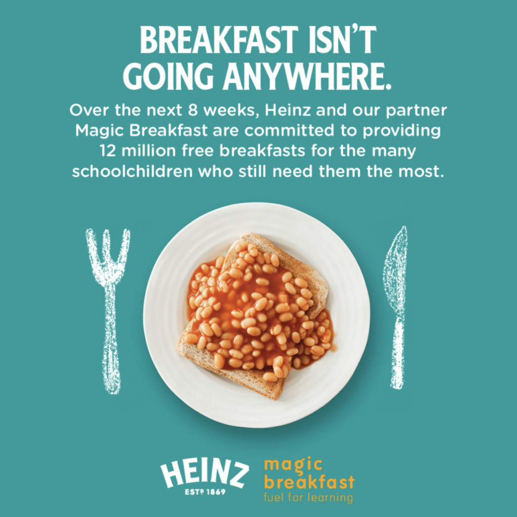 Heinz UK realized early that this would be a problem for many parents and joined forces with food charity Magic Breakfast. Their mission was to provide 12 million breakfasts for school children. The program is aimed at the kids that otherwise would be provided a free breakfast at school.