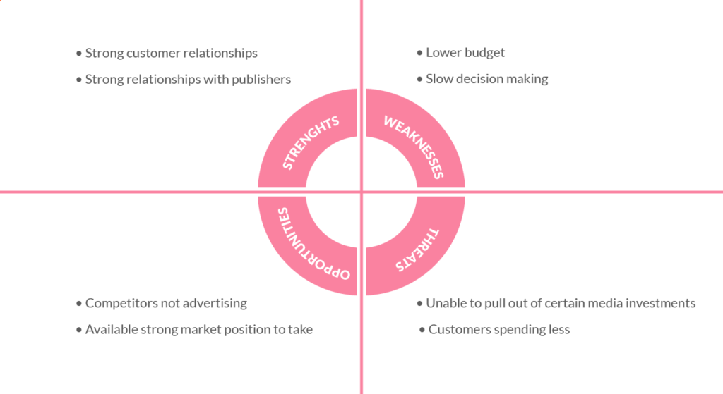 Adjust your SWOT analysis to where your industry is at right now and find cost-efficient ways to stay relevant for the target audience.