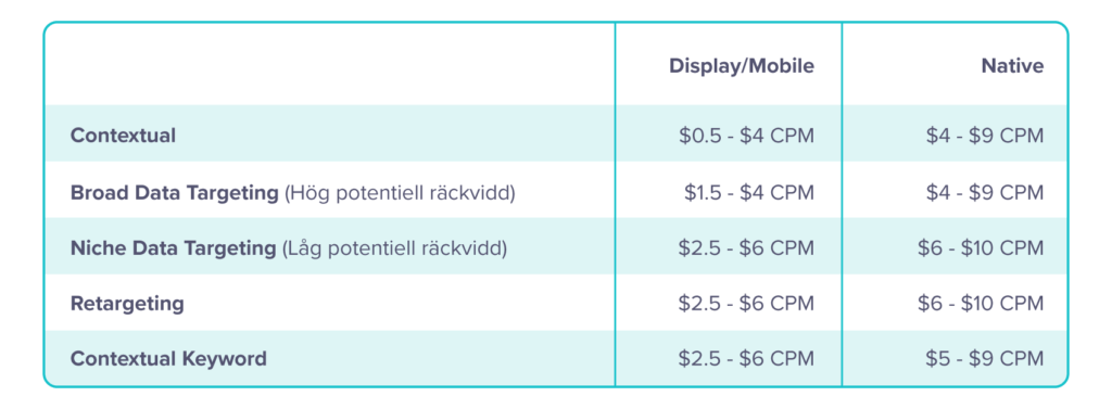 I en programmatisk displaykampanj ligger de genomsnittliga CPM-priserna ofta mellan $0,50 – $4. En native-kampanj skjuter ofta långt bortom detta och når $10, eller till och med över $20.